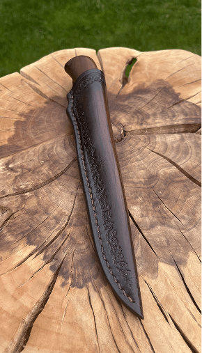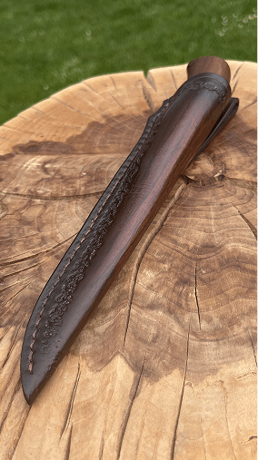 Obal na nůž lemovaný rzí, barvený tmavohnědou na hřbetu tak, aby ladila s rukojetí.