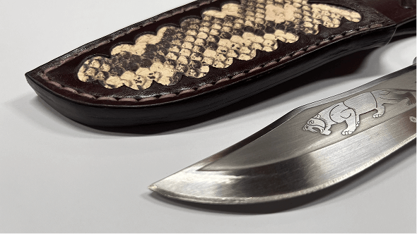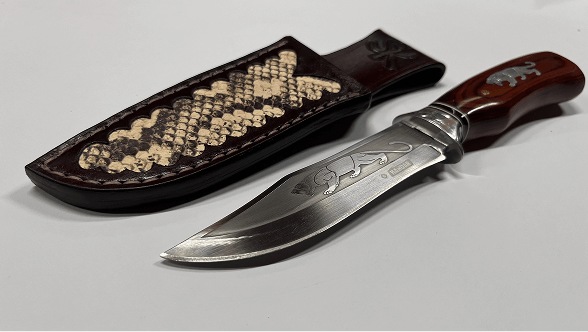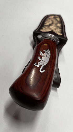 Dámský obal na nůž barvený mahagonem, vykládaný hadí kůží. V sobě má magnet pro lepší upevnění čepele.