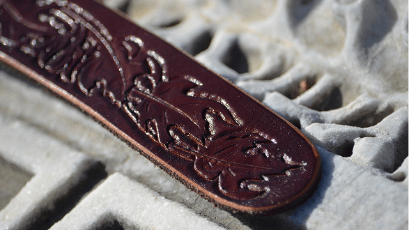 Dámský opasek zdobený modelovanými javorovými listy a barvený tmavohnědou.